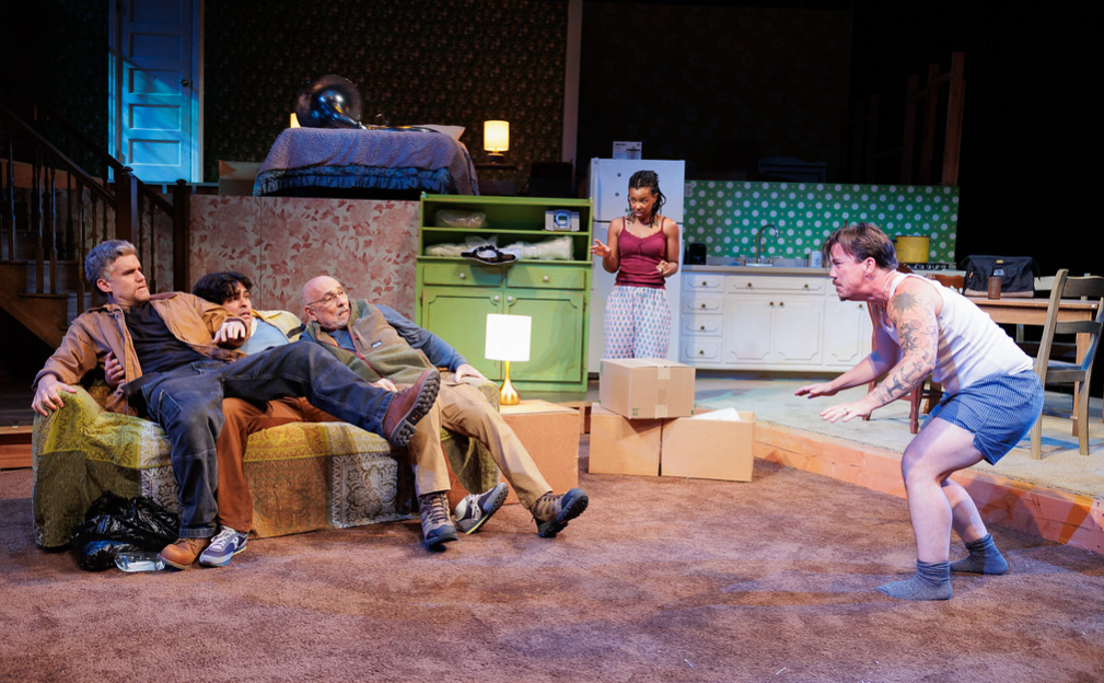 Adam Rigg’s scenic design is a split-level house that transforms as quickly as the family inside, acting as the production’s most visible metaphor. The walls shift, the boxes multiply, the rooms echo with old history.